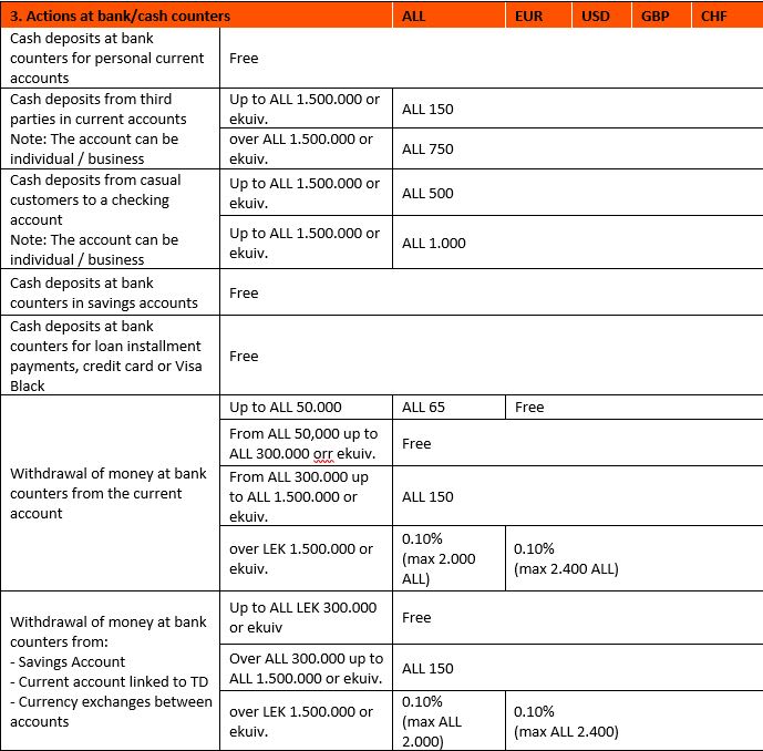 Also, starting from 01/03/2023, for withdrawals at the bank's counters from the current account and the savings account, for amounts over 1,500,000 Lek/equivalent, a 0.1% commission (max. 2,000 Lek) will be applied for withdrawals in Lek and 0.1% (max 2,400 Lek) for withdrawals in foreign currency."